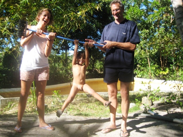 John Kevin laesst sich von Nora und Axel schaukeln, waehrend Anna sachkundig die Helikonien betrachtet und Niels beim Surfen ist.